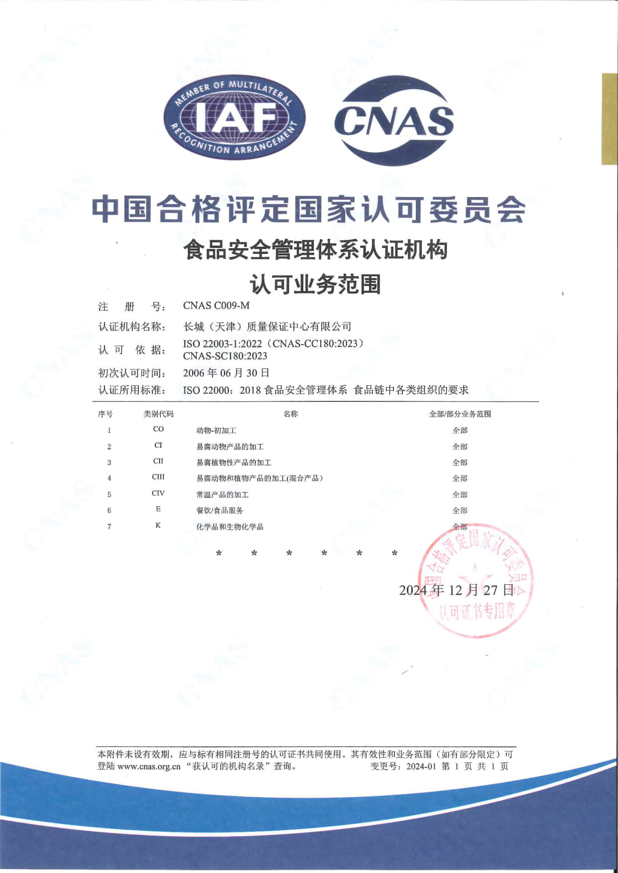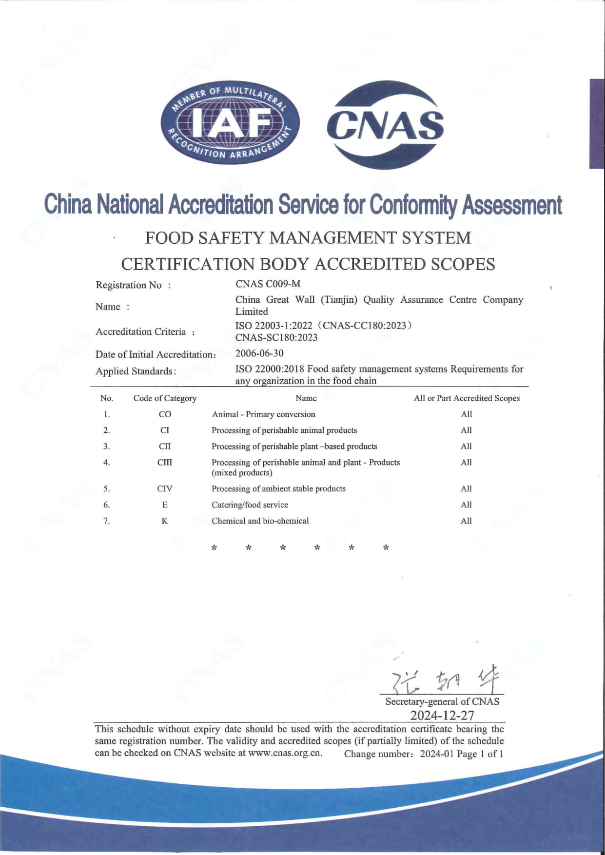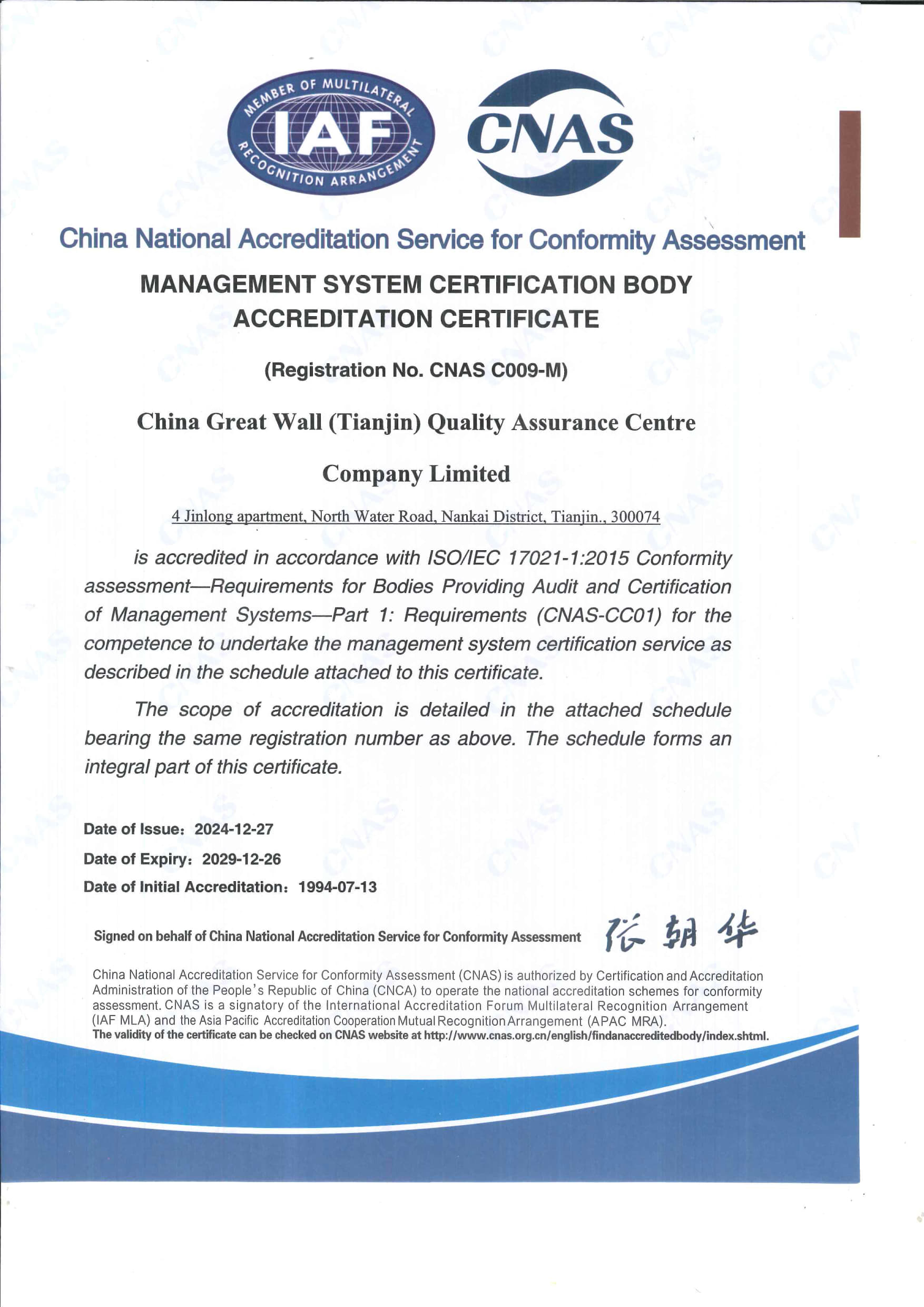 長城(天津)質量保證中心有限公司(簡稱“長城中心”),出資人為天津國興資本運營有限公司,是國有法人獨資企業。長城中心是經國家認證認可監督管理委員會批準認證資格、經中國合格評定國家認可委員會批準CNAS認可資格的具有獨立法人資格的第三方認證機構,是中國認證認可協會的常務理事單位。 長城中心1993年首批獲得國家認可并批準注冊,具備國際認證認可論壇IAF國際互認資格,現已發展為遍涉全國認證業務的大型綜合性認證機構之一。 長城中心具有質量管理體系、環境管理體系、職業健康安全管理體系、食品安全管理體系、危害分析 [查看詳情]